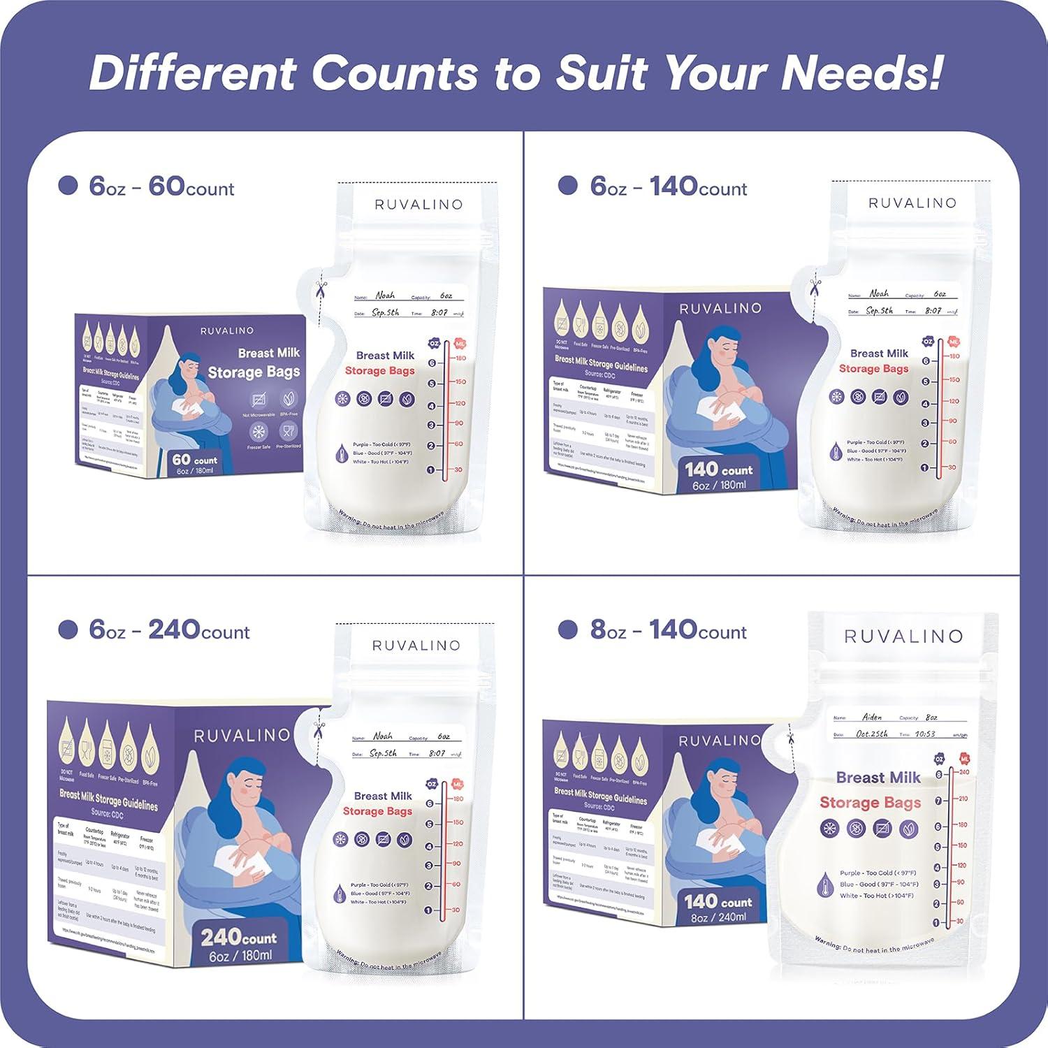 Great Value for Counts: Choose from different sizes (6oz, 8oz) and counts (60, 140, 240) to personalize your selection based on your daily expressing routine, milk output, and budget. Your peace of mind is our priority. We're confident you'll love our RUVALINO breast milk storage bags. However, if you're not thrilled with them for any reason, simply let us know. We’ll take them back and refund your purchase—no questions asked. Click 'Add to Cart' and enjoy worry-free breast milk storage