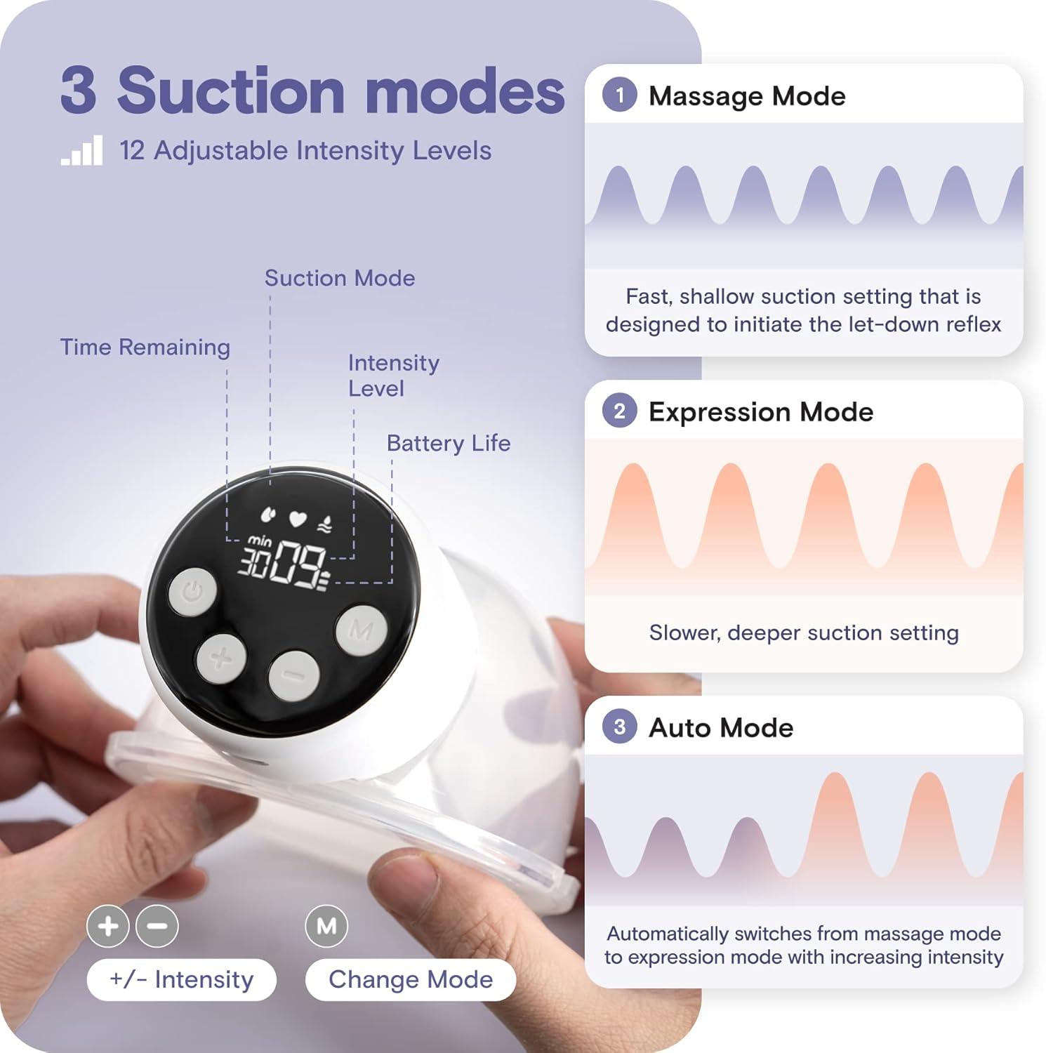 Hands-Free Breast Pump: The cutting-edge S12A wearable breast Pump boasts 3 unique suction modes (Auto, Expression, Massage) and 12 intensity levels, allowing you to customize your pumping session to your exact preferences. The S12A's advanced auto mode simplifies the pumping process by automating the transition between Massage and expression phases, making it more user-friendly and reducing the need for manual adjustments, especially for first-time moms